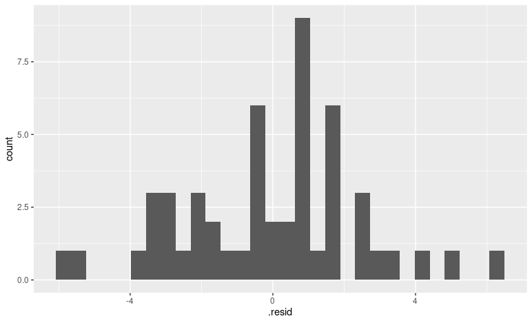 Friendly reminder, residual is the difference between an observed y value(실제 데이터값) and the expected y value(회귀모델로부터의 예측값). 코드를 살펴보기전에, 새로운 함수 augment()를 소개하겠습니다. glance()와 마찬가지로 broom패키지에 속하고, 모형을 각 데이터에 적용하는 함수입니다.