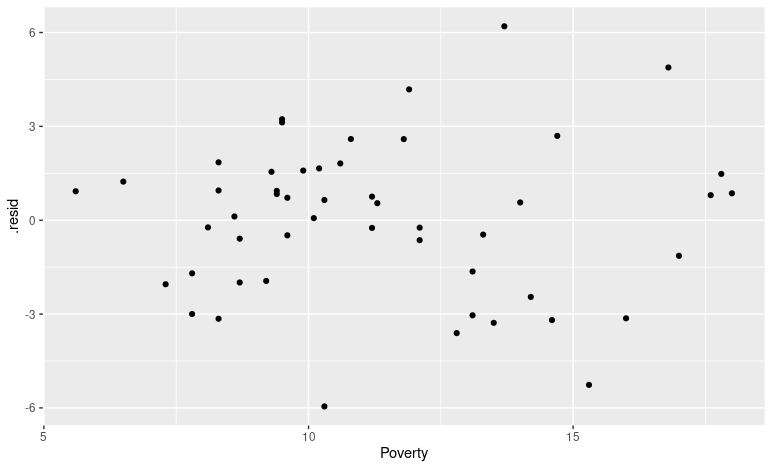In general, our residuals were smaller(잔차값이 작기에, 예측도가 더 정확하겠죠?) for states that had lower poverty levels. At higher poverty levels (15% 주변) the residuals were becoming larger in magnitude(절대값의 크기를 확인해보면, 잔차들의 값이 크다는 점을 확인할 수 있습니다).